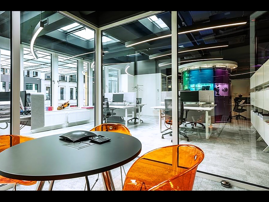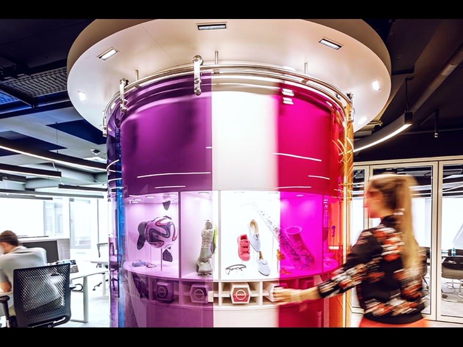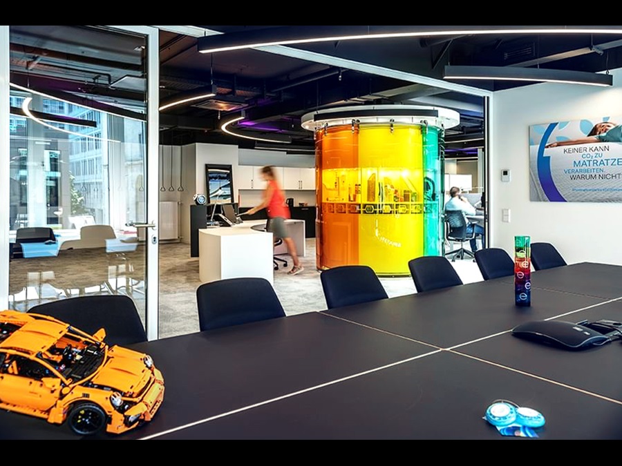 The Liaison Office is notable for its spacious and open area. It provides the setting for discussions in groups, as well as for larger events. In the center of the room is a spatial column element for the presentation of several exhibits. Visitors can touch and feel consumer goods made of polyurethane and polycarbonate, among other materials.