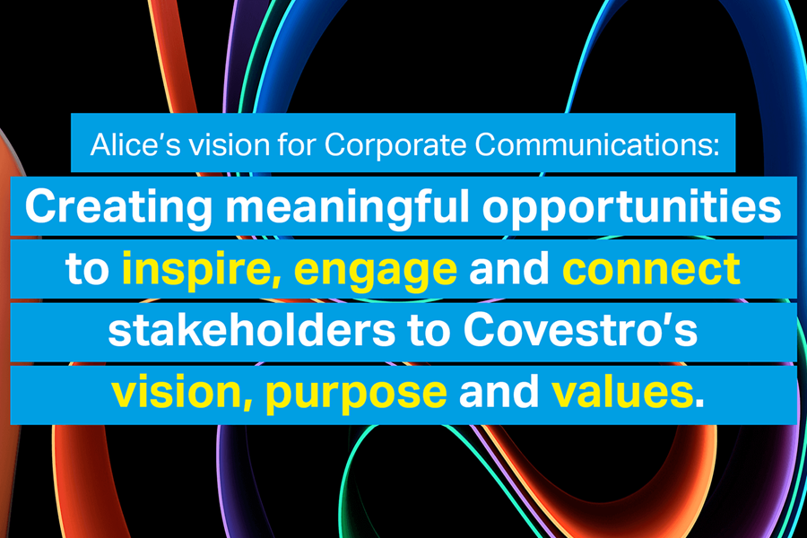 Since beginning her career at Covestro as an intern in 2006, Alice has built a dynamic and well-rounded background in corporate communications. She has held roles spanning internal and external communications, with expertise in media relations, advertising, speechwriting, public affairs, executive communications and branding. Before assuming her current position, she served as director of U.S. Corporate Communications.