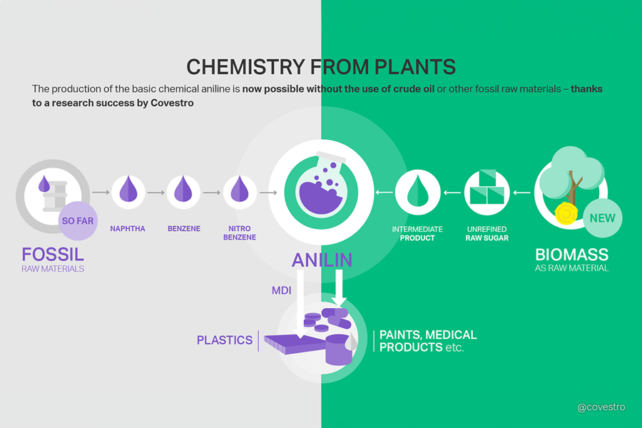 The process, which has already won several awards, leads to a significantly improved CO2 footprint of the aniline compared to conventional technology. Industrial (“white”) biotechnology also comes into play. A tailor-made microorganism helps convert an industrial sugar obtained from plants into an intermediate product through fermentation. In a further step, this is then converted into aniline, which consists of one hundred percent vegetable carbon. The new technology thus contributes to the circular economy, to which Covestro is fully aligned.