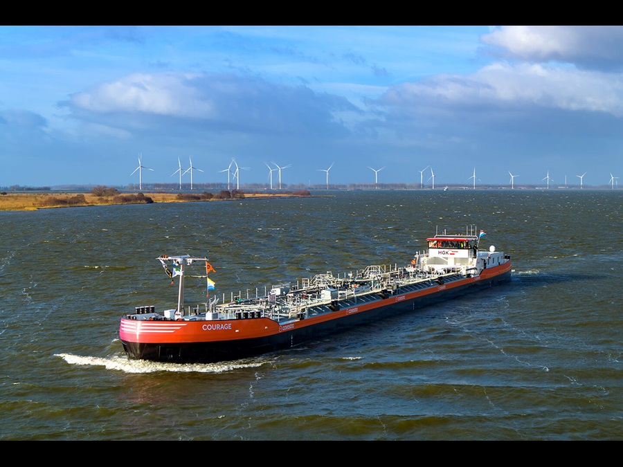One of two low-water ships, the "Courage" transports finished Covestro products across the Rhine.